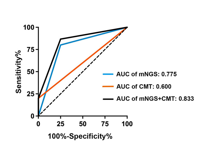 Comparison of the diagnostic value between mNGS and CMTs. AUC: area under the receiver operating characteristic curve; CMT: conventional microbiological test; mNGS: metagenomic next-generation sequencing.