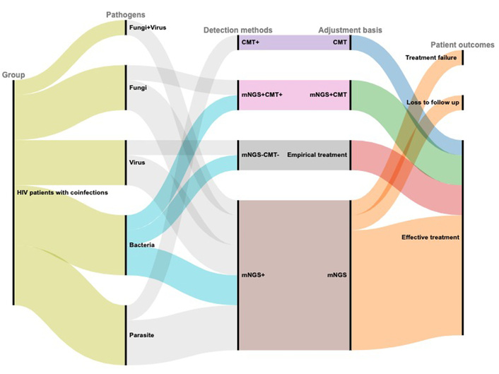 Sankey diagram demonstrating the treatment adjustments and outcomes based on mNGS and CMT in HIV patients with coinfections. This figure was generated via the RAWGraphs website https://rawgraphs.io. CMT: conventional microbiological test; HIV: human immunodeficiency virus; mNGS: metagenomic next-generation sequencing.