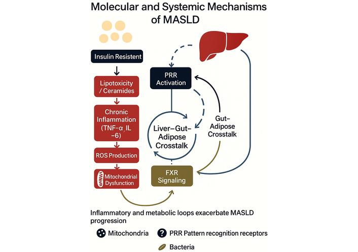 Illustration of the molecular and systemic pathomechanisms involved in MASLD. Graphical model illustrating the molecular and systemic mechanisms driving the progression of metabolic dysfunction-associated steatotic liver disease (MASLD). Insulin resistance initiates lipotoxicity through ceramide accumulation, promoting chronic inflammation mediated by tumor necrosis factor-alpha (TNF-α) and interleukin-6 (IL-6). This cascade leads to reactive oxygen species (ROS) production and mitochondrial dysfunction. Pattern recognition receptor (PRR) activation and bile acid-related farnesoid X receptor (FXR) signaling modulate liver–gut–adipose crosstalk, reinforcing metabolic and inflammatory loops. These interorgan interactions perpetuate MASLD pathogenesis and systemic involvement. Image created using GraphPad Prism version 10, and Microsoft PowerPoint 2021.