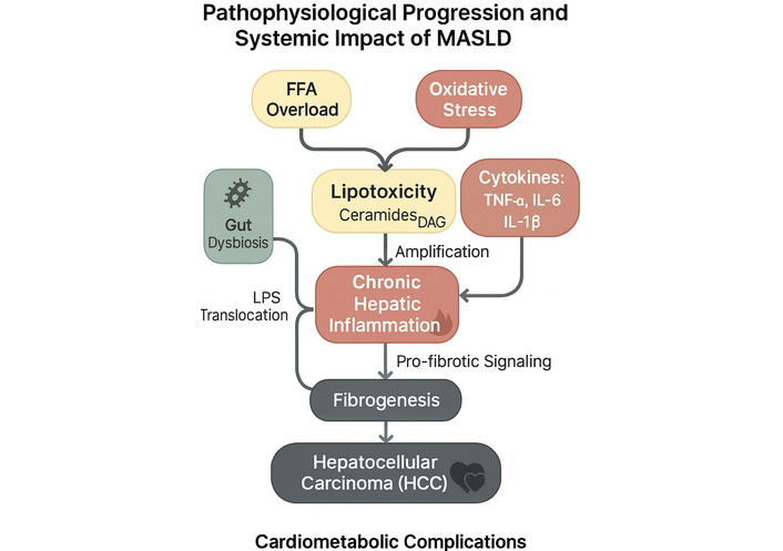 The central pathophysiological mechanisms involved in MASLD—including insulin resistance, lipotoxicity, chronic inflammation, and gut dysbiosis—culminate in progressive liver damage and systemic complications, as illustrated in the mechanistic diagram (Figure 3).