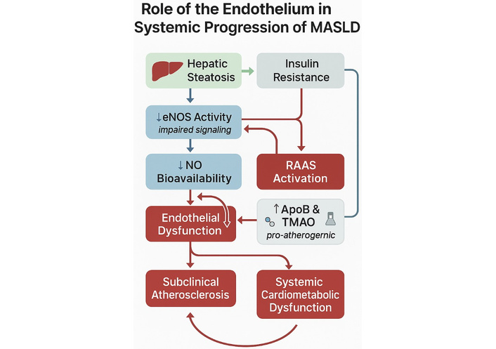 In summary, endothelial dysfunction not only precedes but also integrates and amplifies MASLD progression toward cardiovascular, renal, and systemic complications. This underscores the need for endothelial screening strategies and targeted therapies to preserve vascular function from the earliest stages of the disease.
