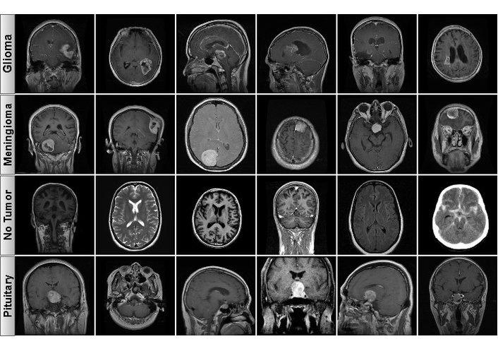The data infrastructure for this research is referred to as the “Brain Tumor MRI Dataset”, which consists of a dataset created by Ahmed Sorour that is publicly available on Kaggle [38]. This dataset is a source of reference material for brain tumor classification and includes three common tumor classes: Glioma, Meningioma, and Pituitary. There is also a control group consisting of healthy brain MRIs with no tumor. There is a total of 5,249 T1-weighted, contrast-enhanced MRI slices that are noted as to their pathological state or normal. Figure 1 includes samples of the classes to illustrate the types of data included in the dataset.