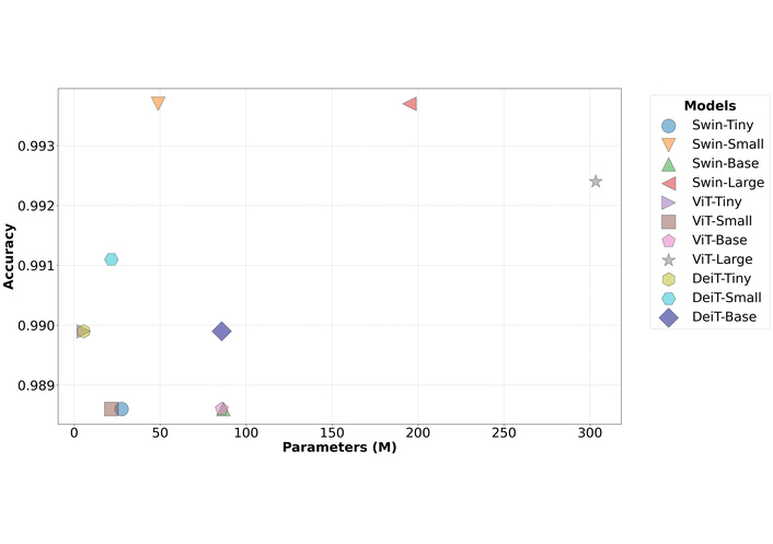 Results: All evaluated models demonstrated high accuracy (> 98.8%). The Swin-Small and Swin-Large models achieved the highest accuracy of 99.37%. Remarkably, Swin-Small delivered this top-tier performance at a fraction of the computational cost of the Swin-Large model, which is nearly four times its size and with more than double the inference speed (0.54 ms vs. 1.29 ms), showcasing superior operational efficiency.