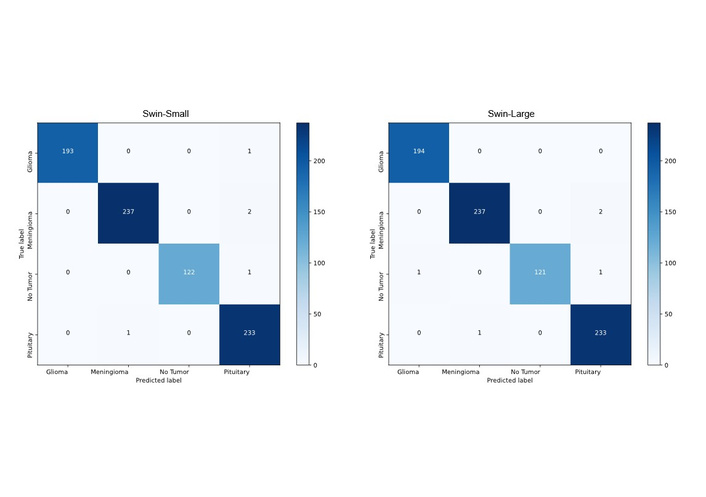 Similarly, the DeiT-Small model demonstrated exceptional efficiency, achieving a higher F1-score (99.10) than the much larger ViT-Base and Swin-Base models with only a fraction of the parameters (21.67M). The confusion matrices for the top-performing Swin-Small and Swin-Large models (Figure 3) further confirm their robustness, showing minimal misclassifications across all four categories.