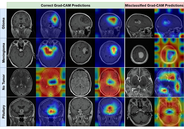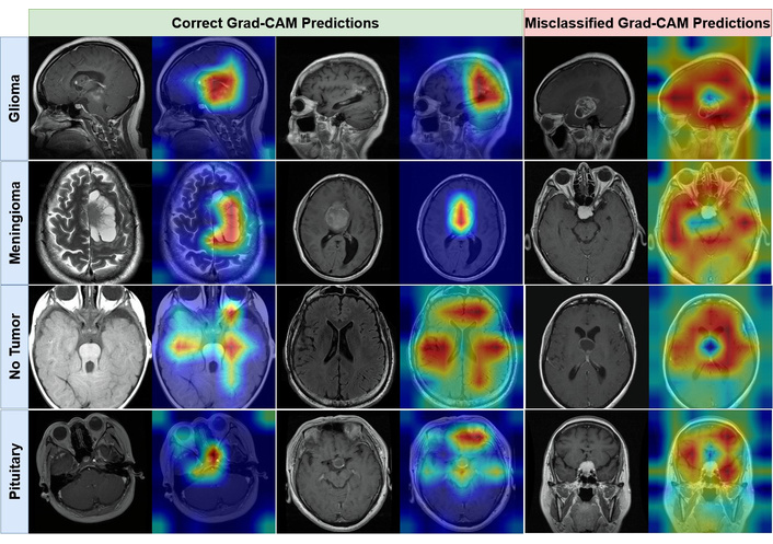 Visual interpretability of the Swin-Small model using Grad-CAM. The figure contrasts activation heatmaps for correctly classified examples (left panel) with those from misclassified examples (right panel) for Glioma, Meningioma, No Tumor, and Pituitary. Grad-CAM: Gradient-weighted Class Activation Mapping.