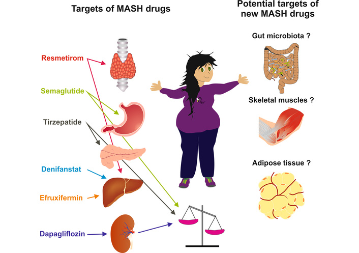 Targets and potential targets of MASH drugs. Graphical illustration of the variety of organ targets underlying the various mechanisms of action of resmetirom, semaglutide, tirzepatide, denifanstat, efruxifermin, and dapagliflozin. Major determinants of MASH pathogenesis, including gut microbiota, skeletal muscle, and visceral adipose tissue, are potential targets of innovative drugs in this field. MASH: metabolic dysfunction-associated steatohepatitis.