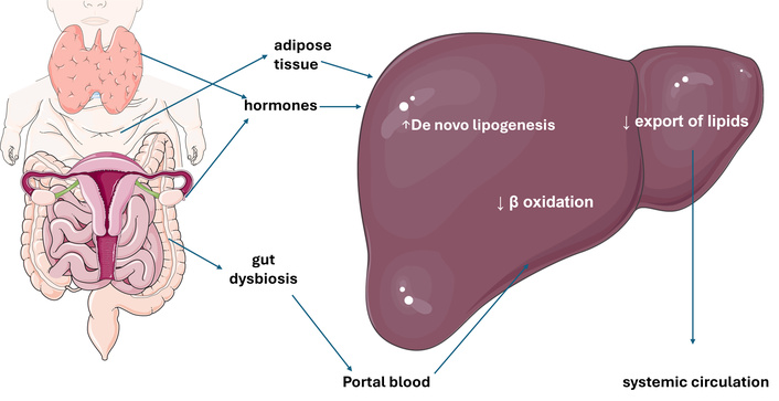 Principal pathomechanisms involved in MASLD. Schematic representation of extrahepatic and hepatic determinants of MASLD. Increased lipogenesis from expanded and inflamed adipose tissue results in an overflow of fatty acids inundating the liver. This increased substrate supply, along with reduced β oxidation of triglycerides and decreased capacity to export lipids into the bloodstream, leads to increased lipogenesis, facilitated by insulin resistance. Concurrently, gut dysbiosis induces a leaky gut condition, allowing bacterial antigens to enter the portal system, contributing to maintaining a proinflammatory state within the hepatic tissue. Finally, various gene variants and hormonal changes facilitate the development and progression of MASLD. MASLD: metabolic dysfunction-associated steatotic liver disease. The original illustration, based on current pathogenic views [3], was created using Servier Medical Art (https://smart.servier.com) and licensed under CC BY 4.0 (https://creativecommons.org/licenses/by/4.0/).