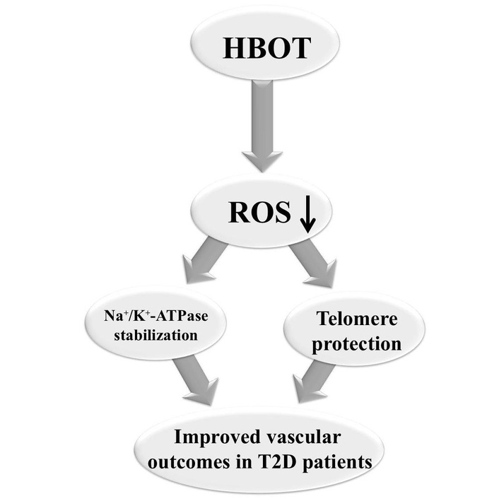 Investigation of the mechanisms by which HBOT exerts its effects on Na+/K+-ATPase expression/activity and TL in states of T2D and associated microvascular complications has the potential to improve therapy further. Optimizing HBOT timing could represent a step toward personalized medicine. Understanding an entirely new area of vascular biology and applying it to a pandemic disease is a significant step in basic research. There is a need for such an approach because glucose-lowering drugs have insufficient long-term benefits in T2D patients. Microvascular complications are common in patients with T2D. Indeed, it remains relevant to pursue fundamental research in this area and to broaden our understanding of the underlying mechanisms of T2D-related microvascular complications. Currently, most investigations focus on confirming the epidemiological links between T2D and vascular diseases. Only a limited number of studies have examined causality. The derangements of various metabolites do not explain their role in promoting microvascular disease in T2D. HBOT functions as a therapeutic stimulus that modulates redox-sensitive signaling pathways by increasing oxygen availability. In addition, by regulating redox homeostasis, HBOT may influence telomere dynamics. Repeated HBOT decreases OS and impairs ROS-induced guanine oxidation, a major driver of rapid telomere shortening, especially in telomeric regions rich in G-bases. By stabilizing telomerase activity and maintaining telomere structure, HBOT-induced modifications in redox-sensitive signaling pathways could also decrease the activation of the DNA-damage response and consequently postpone the onset of cell senescence [19, 44]. This perspective proposes HBOT not only as a therapeutic strategy but also as a regulator of potential biomarkers of therapeutic response, such as Na+/K+-ATPase and TL. Previously proposed approaches were predominantly focused on OS or metabolic effects of HBOT, whereas this perspective links redox-sensitive signaling to cellular aging processes. It provides a new hypothesis that HBOT can directly affect Na+/K+-ATPase and TL, which are proposed as potential biomarkers of HBOT response (Figure 1). HBOT’s effects on Na+/K+-ATPase regulation and TL in T2D patients and in patients with microvascular diseases could represent a novel treatment approach, leveraging newly identified biomarkers for T2D-related vascular diseases. Thus, unraveling the specific responses of Na+/K+-ATPase and TL to HBOT will be a significant step forward in understanding microvascular complications in T2D, toward a more integrated view of the treatment of this disease, and to foster improved evidence-based interventions. Future research priorities should focus on enhancing the therapeutic application of HBOT in T2D, including determining the optimal timing and duration of HBOT treatment, confirming reliable biomarkers for monitoring therapeutic efficacy, and investigating its incorporation into tailored treatment programs. Addressing these criteria is critical to transforming HBOT from a promising theoretical framework into a practical, tailored diabetes management solution. Other biochemical factors, including protein aggregation, pH-dependent proteome stability, and metformin-related molecular interactions, may also contribute to the complex pathophysiology of T2D, and all these factors will be explored in our future studies.