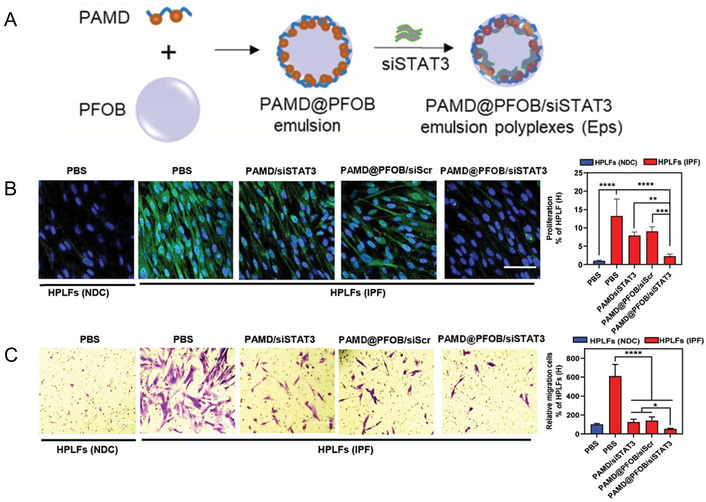 Schematic illustration of the components and preparation of cationic polymer/siRNA/PFOB nanoemulsion in inhibiting IPF. (A) Preparation of PAMD@PFOB/siSTAT3 Eps. (B) Immunofluorescence staining of α-SMA (green). Cell nuclei stained with DAPI (blue) (scale bar = 100 µm, n = 6). (C) Representative images of fibroblast migration with different treatments (n = 3). Adapted from [23]. © 2022 The Authors. Distributed under a license of CC BY. IPF: idiopathic pulmonary fibrosis; PFOB: perfluorooctylbromide.
