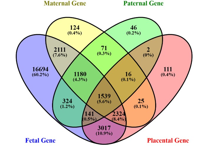 Venn diagram representing the distribution and overlap of reported maternal, paternal, placental, and fetal genes extracted from the GeneCards database.