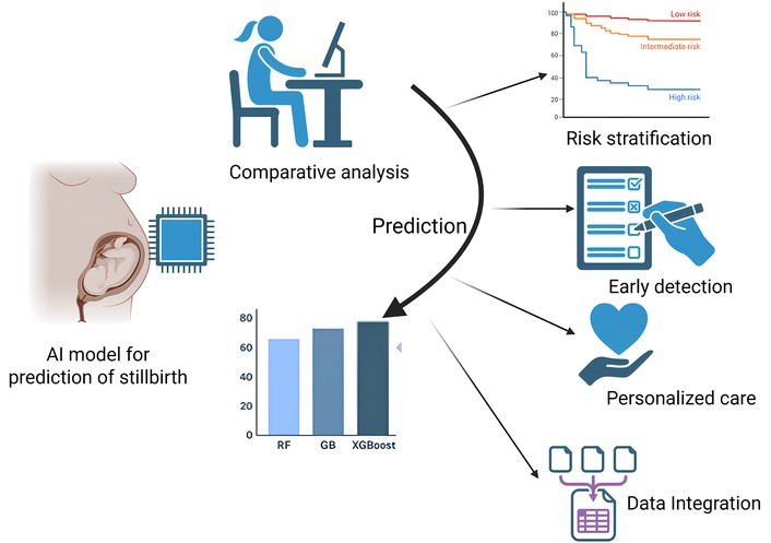 The use of AI and IoT technology in the precise prediction of stillbirth is still understudied, despite the growing awareness of unfavorable pregnancy outcomes worldwide. There is a dearth of research specifically focused on stillbirth prediction, despite the fact that several AI-driven models have been created for related obstetric outcomes such preterm delivery, foetal growth restriction, and preeclampsia [86]. The majority of current research either uses small, retrospective datasets with low generalizability or treats stillbirth as a secondary goal. A significant gap in the translational pipeline is that there is currently no extensively verified or clinically used AI model created specifically for stillbirth risk prediction. Experts have a scarce understanding of how AI with IoT systems can precisely predict stillbirth, even though awareness of adverse pregnancy outcomes continues to increase globally [87, 88]. The medical field lacks proper research on stillbirth prediction, even though several AI-based models predict related obstetric outcomes, including preterm delivery, foetal growth restriction, and preeclampsia [89]. Most existing studies base their research on limited retrospective datasets that offer restricted possibilities for generalization, and stillbirth remains their secondary focus. No broadly accepted or clinically deployed model exists for stillbirth risk prediction because the translational pipeline lacks an extensively verified solution designed specifically for this purpose. This shortage of AI applications targeting specific risk assessment delays the progress toward essential predictive models that serve the precision medicine framework. The combination of AI methods renders the possibility to unite data types, including electronic medical records, together with continuous monitoring data and molecular biomarkers, including sFlt-1 and PlGF, for detecting concealed patterns leading to stillbirth occurrences [90]. Organizations should initiate AI-based prospective research on stillbirth, which focuses on risk profiling, biomarker development, and longitudinal statistical analysis. A successful reduction of research gaps in neonatal care requires joint work between data scientists, physicians, and biological researchers across multiple disciplines [89]. Achieving explainable AI frameworks through future research should focus on developing tools that physicians can rely upon, together with multi-cultural verification that enables simple digital health platform integration.