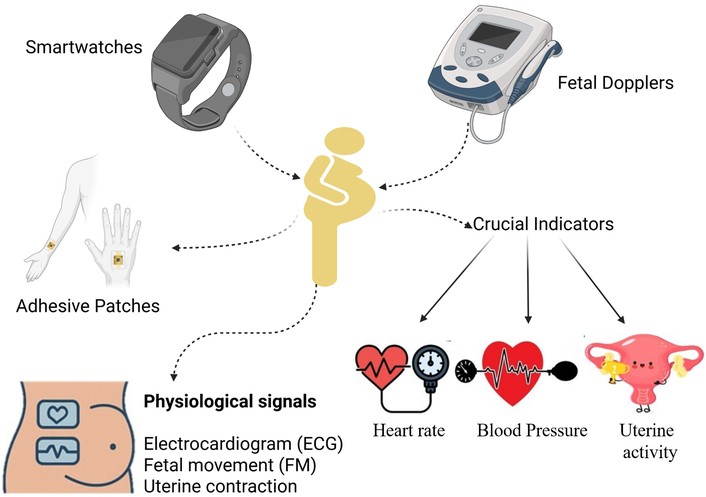 Illustration of sensor placement on a pregnant woman for maternal and fetal monitoring. Brief history of non-invasive and wearable devices used to monitor maternal and fetal health. Constant recording of physiological signals such as electrocardiography (ECG), fetal movement (FM), uterine contractions, heart rate, and blood pressure are done using smartwatches, adhesive biosensor patches, and fetal Dopplers. These critical signs allow tracking and prioritizing risks in the course of pregnancy.