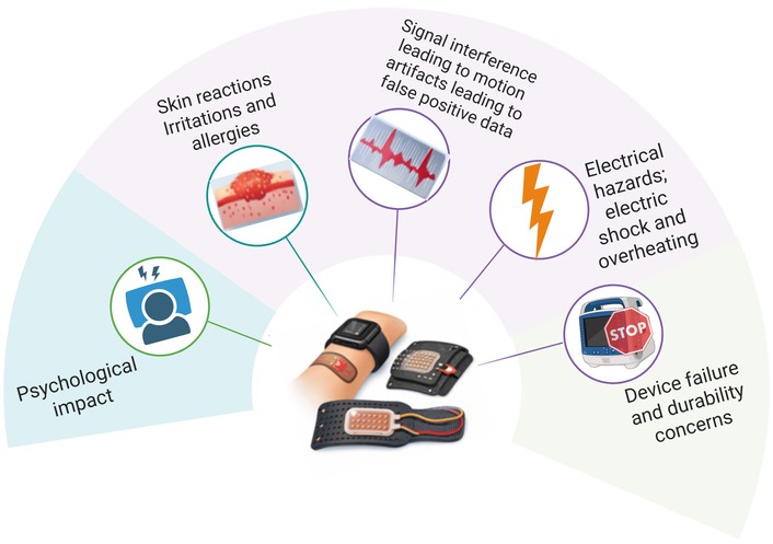 Schematic illustration summarizing the major risks related to prolonged use of wearable sensors. These involve skin responsiveness such as irritation and allergic response caused by sustained skin contact; signal interference caused by environmental noise and body movement, leading to motion artefacts and false-positive results; electrical hazards, e.g., the risk of electric shock and overheating during prolonged use; component failure and wear problems, e.g., mechanical stress, material wear or repetitive use; psychological effects, e.g., increased anxiety caused by a false alarm or a non-linear feedback. The main character displays a typical set of wearable devices, whereas the background items reveal the main types of risk that are essential in the safety assessment and Materiovigilance of wearable healthcare systems.