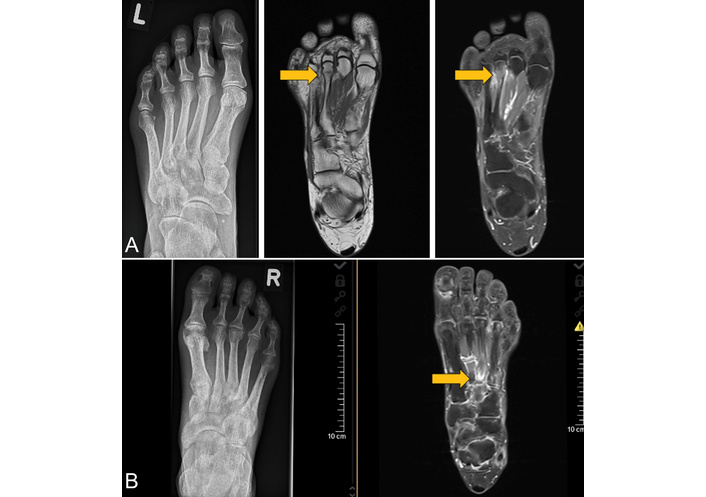 A conventional radiograph (left figure) and MRI of two patients with an IF radiographically not detected. (A) Images of a 56-year-old woman with RA, disease duration 2.5 years. MRI of the left foot showing a subcapital fracture of the 3rd metatarsal head. The T1w MRI sequence (middle figure) shows the fracture as a hypointense line, while the contrast-enhanced fat-saturated T1w MRI sequence (right figure) reveals the reaction of the periosteum and an activation of the BM (gray arrows). This finding is similar in cases of periostitis and osteitis. (B) Images of a 61-year-old male patient with PsA, disease duration 6 years. The MRI shows a fracture of the base of the 3rd metatarsal in the right foot (gray arrow). The anatomy of this area makes the radiographic detection of fractures difficult. Therefore, MRI clearly is the method of choice to find fractures. The contrast-enhanced fat-saturated T1w MRI sequence reveals the fracture as a hypointense line, also with signs of reactive periosteal and BM activation. IF: insufficiency fracture; MRI: magnetic resonance imaging; BM: bone marrow; PsA: psoriatic arthritis; RA: rheumatoid arthritis; T1w: T1-weighted. Reprinted from [31]. © 2023 by the Journal of Rheumatology.