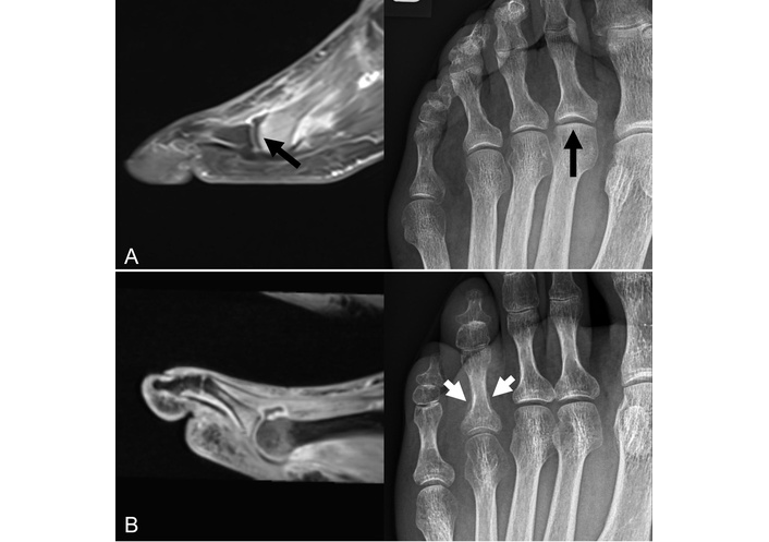 Sagittal contrast-enhanced T1w fat-saturated MRI (left figures) of the forefoot and corresponding X-rays (right figures) of two patients. (A) Images of a 66-year-old female patient presenting with foot pain under suspicion of arthritis. The MRI shows a subchondral fracture of the 2nd metatarsal head. Both radiograph and MRI demonstrate some linear subchondral sclerosis and loss of sphericity of the articular surface due to an infraction (black arrows). (B) Images of a 51-year-old male patient with long-standing axSpA with peripheral involvement, no fracture. The MRI demonstrates dactylitis of the 4th toe with dominant arthritis of the metatarsophalangeal joint, while the X-ray shows a mineralized periostal reaction of the proximal basophalangeal metadiaphysis (white arrows). axSpA: axial spondyloarthritis; MRI: magnetic resonance imaging; T1w: T1-weighted. Reprinted from [31]. © 2023 by the Journal of Rheumatology.