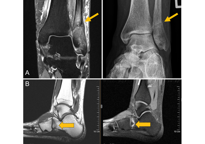 MRI of two and the corresponding radiograph of one patient. (A) Images of a 57-year-old female patient with an osteodestructive course of RA presenting with lateral right ankle pain for about 6 weeks. Both the radiograph and the coronal proton density–weighted turbo spin-echo fat-saturated MRI show a juxtasyndesmal IF of the fibula with reactive thickening of the periosteum and mineralization because of callus formation (gray arrows). (B) MRI of a 42-year-old female PsA patient treated with glucocorticoids and multiple csDMARDs, bDMARDs, and tsDMARDs for approximately 10 years. The T1w-MRI shows a blurred zigzag-shaped hypointense fracture line at the anterior calcaneus with surrounding BME depicted by the STIR MRI sequence. IF: insufficiency fracture; MRI: magnetic resonance imaging; BME: bone marrow edema; T1w: T1-weighted; STIR: short tau inversion recovery; csDMARD: conventional synthetic disease-modifying anti-rheumatic drugs; bDMARD: biologic disease-modifying anti-rheumatic drugs; tsDMARD: targeted synthetic disease-modifying anti-rheumatic drugs. Reprinted from [31]. © 2023 by the Journal of Rheumatology.