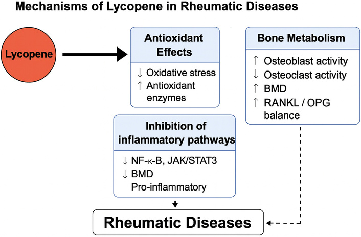 Accumulating evidence suggests that diets rich in lycopene are associated with reduced inflammation, improved endothelial function, and lower risks of cardiovascular and metabolic diseases [4]. Given the shared mechanisms of oxidative stress and inflammation across systemic inflammatory diseases, there is increasing interest in its potential applications within rheumatology. This review integrates clinical, experimental, and mechanistic evidence regarding lycopene supplementation in rheumatic and musculoskeletal disorders, focusing on bone and connective tissue homeostasis.