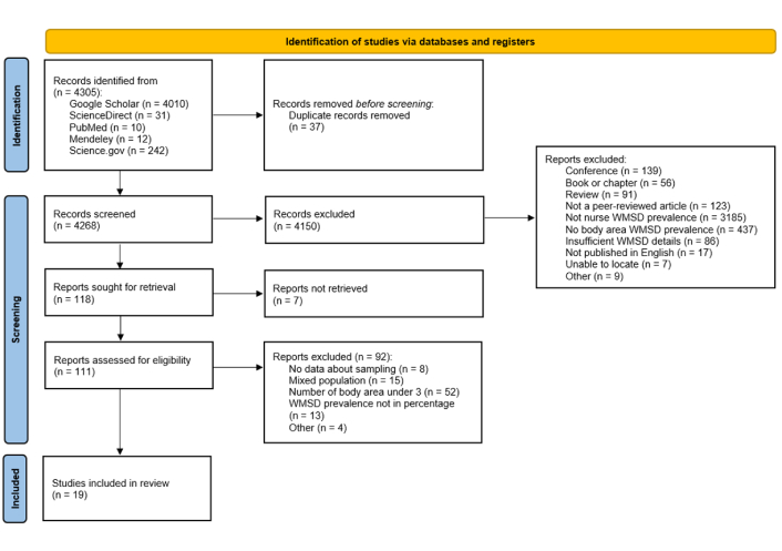 The use of keywords enabled a total of 4,305 studies to be extracted from the five databases. After removing 37 duplicates, 4,150 studies were excluded because they did not meet the study inclusion criteria (incorrect format, study not involving African nurses, or lack of details about WMSDs). Of the remaining 118, 92 were removed from the study because the samples included different healthcare professionals without any distinction between the different professions, the presentation of WMSDs did not allow the results to be reported on a total sample of nurses, or the number of body areas covered was less than three, etc. Reports from seven studies could not be retrieved, resulting in their exclusion. Finally, 19 cross-sectional studies were included, for a total of 4,670 participants. Figure 1 illustrates the process of study selection.