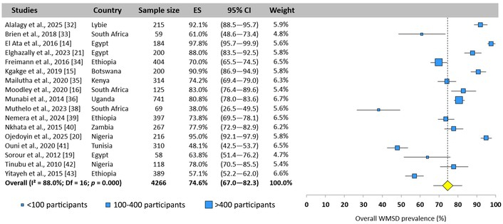 Overall WMSD prevalence pooled for all African nurses. Each blue square represents the mean value reported for each cross-sectional study. The size of the squares is proportional to the sample size (< 100; 100–400; > 400 participants). The yellow diamond represents the pooled prevalence across all 17 studies. The horizontal line is the 95% confidence interval (95% CI). ES: effect size; WMSD: work-related musculoskeletal disorder.