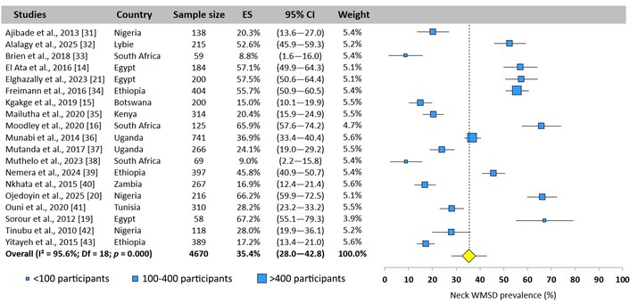 Neck WMSD prevalence pooled for all African nurses. Each blue square represents the mean value reported for each cross-sectional study. The size of the squares is proportional to the sample size (< 100; 100–400; > 400 participants). The yellow diamond represents the pooled prevalence across all 19 studies. The horizontal line is the 95% confidence interval (95% CI). ES: effect size; WMSD: work-related musculoskeletal disorder.