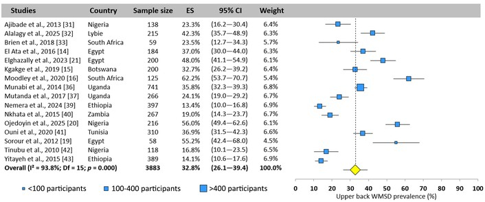 Upper back WMSD prevalence pooled for all African nurses. Each blue square represents the mean value reported for each cross-sectional study. The size of the squares is proportional to the sample size (< 100; 100–400; > 400 participants). The yellow diamond represents the pooled prevalence across all 16 studies. The horizontal line is the 95% confidence interval (95% CI). ES: effect size; WMSD: work-related musculoskeletal disorder.