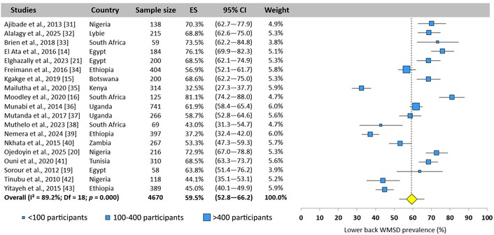 Lower back WMSD prevalence pooled for all African nurses. Each blue square represents the mean value reported for each cross-sectional study. The size of the squares is proportional to the sample size (< 100; 100–400; > 400 participants). The yellow diamond represents the pooled prevalence across all 19 studies. The horizontal line is the 95% confidence interval (95% CI). ES: effect size; WMSD: work-related musculoskeletal disorder.