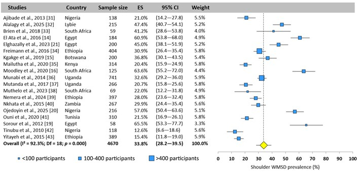 Shoulder WMSD prevalence pooled for all African nurses. Each blue square represents the mean value reported for each cross-sectional study. The size of the squares is proportional to the sample size (< 100; 100–400; > 400 participants). The yellow diamond represents the pooled prevalence across all 19 studies. The horizontal line is the 95% confidence interval (95% CI). ES: effect size; WMSD: work-related musculoskeletal disorder.