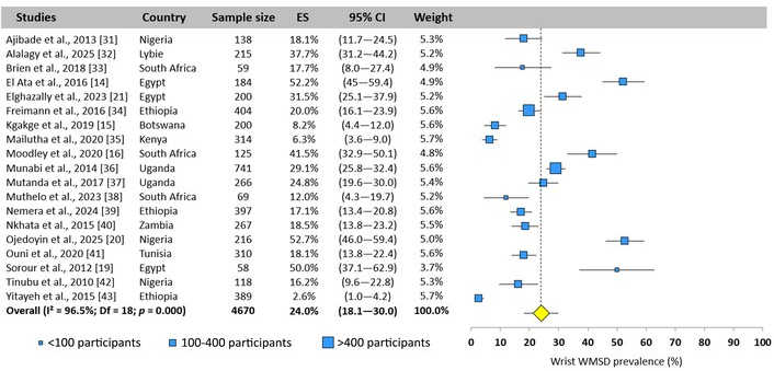 Wrist WMSD prevalence pooled for all African nurses. Each blue square represents the mean value reported for each cross-sectional study. The size of the squares is proportional to the sample size (< 100; 100–400; > 400 participants). The yellow diamond represents the pooled prevalence across all 19 studies. The horizontal line is the 95% confidence interval (95% CI). ES: effect size; WMSD: work-related musculoskeletal disorder.