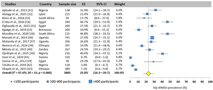 Hip WMSD prevalence pooled for all African nurses. Each blue square represents the mean value reported for each cross-sectional study. The size of the squares is proportional to the sample size (< 100; 100–400; > 400 participants). The yellow diamond represents the pooled prevalence across all 16 studies. The horizontal line is the 95% confidence interval (95% CI). ES: effect size; WMSD: work-related musculoskeletal disorder.