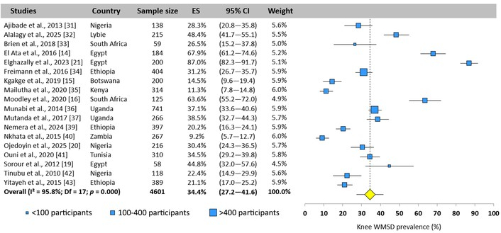 Knee WMSD prevalence pooled for all African nurses. Each blue square represents the mean value reported for each cross-sectional study. The size of the squares is proportional to the sample size (< 100; 100–400; > 400 participants). The yellow diamond represents the pooled prevalence across all 18 studies. The horizontal line is the 95% confidence interval (95% CI). ES: effect size; WMSD: work-related musculoskeletal disorder.