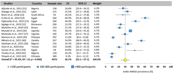 Ankle WMSD prevalence pooled for all African nurses. Each blue square represents the mean value reported for each cross-sectional study. The size of the squares is proportional to the sample size (< 100; 100–400; > 400 participants). The yellow diamond represents the pooled prevalence across all 16 studies. The horizontal line is the 95% confidence interval (95% CI). ES: effect size; WMSD: work-related musculoskeletal disorder.