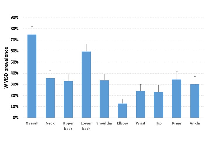 Pooled overall WMSD prevalence and by body area across all included studies. Vertical bars represent the 95% confidence interval; WMSD: work-related musculoskeletal disorder.