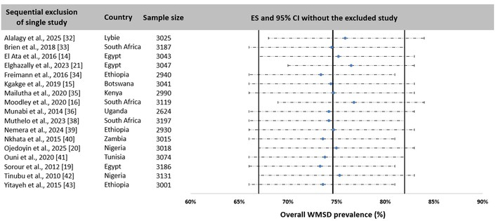 Synthesis of overall WMSD prevalence sensitivity analysis by sequentially excluding studies one by one. Each horizontal line represents the pooled prevalence of all studies without the reference cited in the first column. The central blue circle indicates the mean prevalence. The dotted line represents the 95% CI. The three vertical lines represent the prevalence (central line) and the 95% CI (outer lines) pooled from all 17 included studies. CI: confidence interval; ES: effect size; WMSD: work-related musculoskeletal disorder.