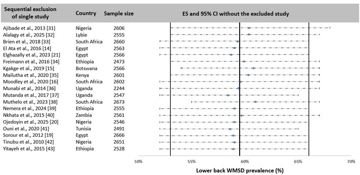 Synthesis of lower back WMSD prevalence sensitivity analysis by sequentially excluding studies one by one. Each horizontal line represents the pooled prevalence of all studies without the reference cited in the first column. The central blue circle indicates the mean prevalence. The dotted line represents the 95% CI. The three vertical lines represent the prevalence (central line) and the 95% CI (outer lines) pooled from all 19 included studies. CI: confidence interval; ES: effect size; WMSD: work-related musculoskeletal disorder.