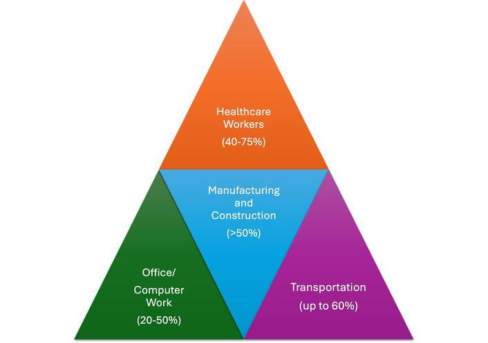 Transportation: Prolonged sitting, whole-body vibration, and static postures are associated with high rates of lower back and neck disorders, with up to 60% prevalence [27].