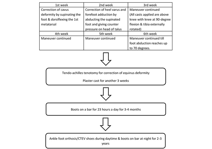 However, the application of the Ponseti method involves several challenges related to technical execution, patient compliance, and logistical barriers. The learning curve is long, and it requires a certain level of skill and expertise for evaluating the deformity and applying the cast correctly. Some commonly observed complications of inappropriate casting are the “Kite” error, rocker-bottom foot, inadequate (below-knee) casting, skin issues, pressure sores, and development of atypical clubfoot. Incidents of inadequate Achilles tenotomy and neurovascular injuries while performing the tenotomy have also been reported. The clinicians should be able to differentiate syndromic and resistant clubfoot from the idiopathic ones to avoid disappointment and treatment failure. Parental non-compliance during casting and bracing protocol is a significant concern. Moreover, the management requires long-term monitoring, which may be challenging to follow. Concerns were also raised about the barriers to the uninterrupted implementation of the standard Ponseti technique [32, 33]. This includes the need for travelling every week and a relatively longer duration of casting, which may increase the dropout rates and increase the number of inadequately treated cases. With time, different accelerated regimens have been suggested to reduce the total duration of treatment, keeping the basic principles unchanged [34, 35]. Recently, a one-week accelerated Ponseti technique has been suggested to be equally effective and safe, and the correction of clubfoot is achieved in one week [36–38]. The lesser duration of casting avoids complications like disuse atrophy and osteopenia and offers faster and cost-effective correction of deformity. The children from remote areas and longer distances facing traveling issues can conveniently stay in or near the treating hospital and undergo initial correction and tenotomy in a single visit. This has been reported to improve their compliance with treatment and reduce the dropout rates [38]. Still, the expense of padding, casting, and tenotomy can be considerable for the families and a significant barrier to the implementation of this method in many countries.