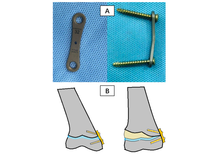 Growth modulation with tension band plate. (A) Figure-of-8 tension band plate and screws; (B) mechanism of action of tension band plate (growth modulation).