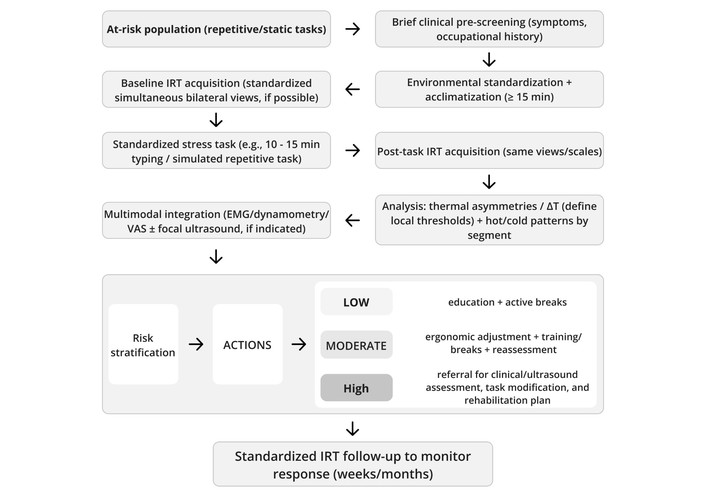 To delineate the utility of IRT, under standardized protocols, as a complementary tool for screening, risk assessment, and monitoring of WMSDs in occupational health, including its application within multimodal interpretation models.