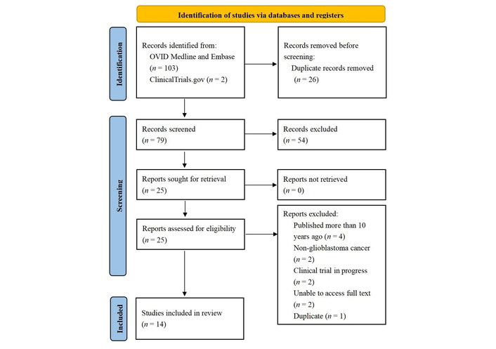 The literature search identified 79 unique records after 26 duplicates were removed (Figure 1). On title and abstract screening, 54 records were excluded, and the remaining 25 articles were retrieved for full-text screening. Of these, 14 papers were included in the final analysis and summarized in Table 1. Three of the articles were preprints published on bioRxiv, which had not yet been peer reviewed but were included due to their relevance [16, 24, 25]. There were two phase 1/2 clinical trials identified (Table 2), NCT04903795 and NCT06814496, but they were not included as they were estimated to be completed in 2026 and 2030, respectively. Another phase 1 clinical trial (NCT03296696) of a BiTE therapy targeting EGFRvIII-positive tumor antigens had an interim analysis completed in 2019 [26], but was prematurely terminated with only an abstract written [27]. As there was no full-text article written about the trial, it was not included in the analysis.