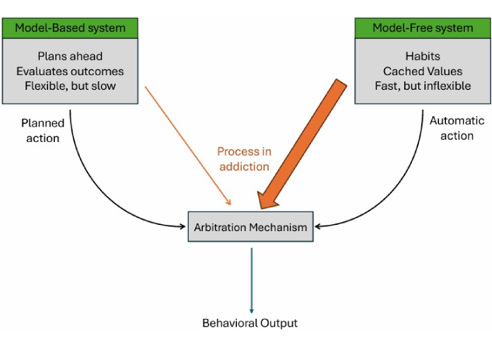 Dual-system models of RL first became prominent in addiction science in 2008. It proposes that behavior emerges from the interplay between two distinct learning systems, an MF and an MB system. The MF system relies on habitual stimulus-response associations based on cached rewards, and the MB system simulates future outcomes and guides behavior through internal planning and inference [27]. These systems differ in both computational cost and behavioral flexibility [35]. The MF system is fast and metabolically efficient but inflexible, relying on habitual stimulus-response associations. In contrast, the MB system is slower and more resource-intensive, but it enables planning, inference, and adaptive decision-making [35]. An arbitration mechanism, supported by prefrontal and striatal circuits, dynamically allocates control between MB and MF systems based on their relative reliability in a given context (see Figure 2) [45].