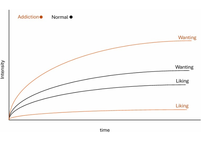Repeated drug exposure sensitizes the mesocorticolimbic dopamine system, producing a pathological dissociation between “liking” (hedonic pleasure) and “wanting” (motivational salience). Over time, “wanting” continues to increase even as “liking” declines, driving craving and relapse. Drug-associated cues acquire excessive motivational power through this sensitization process, triggering compulsive pursuit even when the drug is no longer pleasurable.