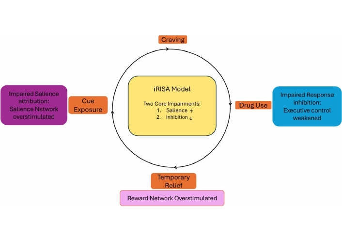 iRISA is supported by robust empirical evidence. The top-down and salience attribution processes used in the iRISA model are thought to involve large-scale brain networks including the limbic-orbitofrontal reward system, the salience network, the prefrontal executive control network, the self-referential (default mode) network, and subcortical circuits involved in habit and memory. Systematic neuroimaging reviews have confirmed consistent abnormalities in exactly these networks across individuals with various substance use disorders [23, 60, 61]. In particular, meta-analytic evidence demonstrates reproducible patterns of dysregulation within the salience and executive control networks, marked by hyperactivation of the anterior insula and ACC during cue exposure, and hypoactivation of the dorsolateral prefrontal cortex (DLPFC) during inhibitory control tasks [23]. These findings establish a neural signature of impaired response inhibition and excessive salience attribution that directly supports the iRISA framework.