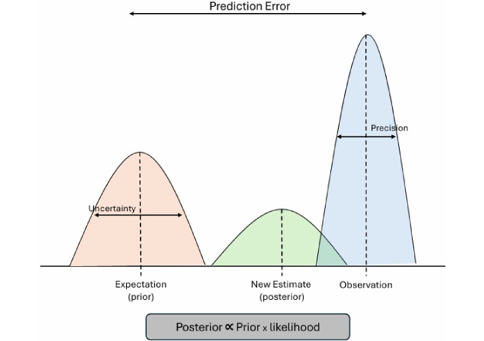 Bayesian models offer a transformative framework for understanding addiction, not as reflexive compulsion or rigid habit, but as an inferential, belief-driven process shaped by context, emotion, and uncertainty. The Bayesian brain theory (BBT) models the brain as a system that represents sensory information probabilistically and performs Bayesian inference by combining prior beliefs and incoming sensory data weighted by their relative uncertainty (precision) (see Figure 5) [62]. This allows the brain to continuously update its internal representations of the world in a statistically optimal manner. This process of belief updating, rather than simple RL, becomes the central mechanism of cognition and behavior. Addiction, in this view, is not merely a loss of control but a failure of inference, where deeply held, high-precision priors about drug relief, emotional regulation, or self-worth persist even in the face of contradictory evidence [63].