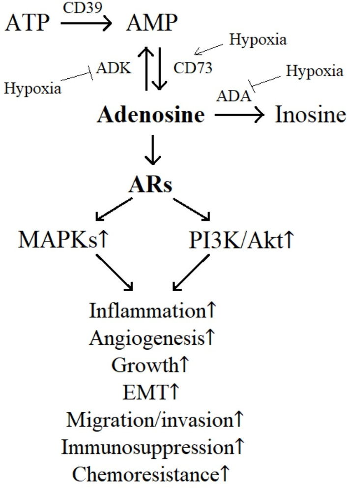 Effects of extracellular adenosine on glioblastoma progression. ADA: adenosine deaminase; ADK: adenosine kinase; Akt: protein kinase B; AR: adenosine receptor; CD39: ectonucleoside triphosphate diphosphohydrolase-1; CD73: ecto-5′-nucleotidase; EMT: epithelial-mesenchymal transition; MAPKs: mitogen-activated protein kinases; PI3K: phosphoinositide 3-kinase.
