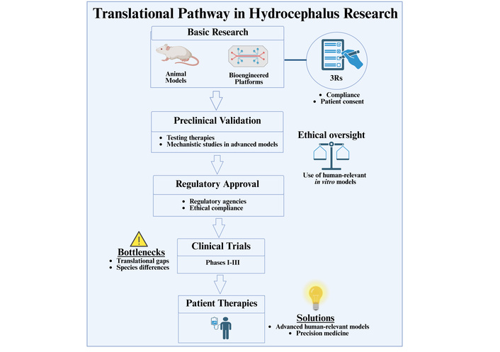 Translational route in hydrocephalus research. Stepwise summary of fundamental research (animal models and bioengineered systems) to preclinical proof, regulatory approval, and clinical investigations, ultimately culminating in patient therapy. Critical checkpoints include ethical concerns (3Rs, patient consent), regulatory advice, and determination of translational bottlenecks (species differences, predictive gaps). The intermingling of high-end human-translatable models and precision medicine strategies offers potential means of overcoming such hurdles as well as rapid acceleration of clinical translation. 3Rs: replacement, reduction, and refinement. Created in BioRender. Angelopoulos, I. (2025) https://BioRender.com/eekhg0f.