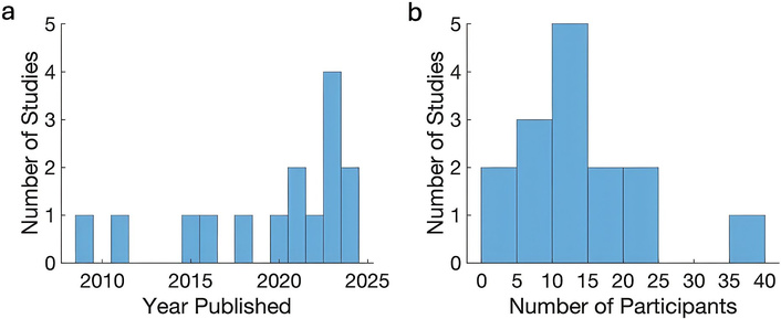 Characteristics of studies surveyed to assess trends in human electrophysiology research. (a) Distribution of study publication years. (b) Distribution of the number of participants per study.