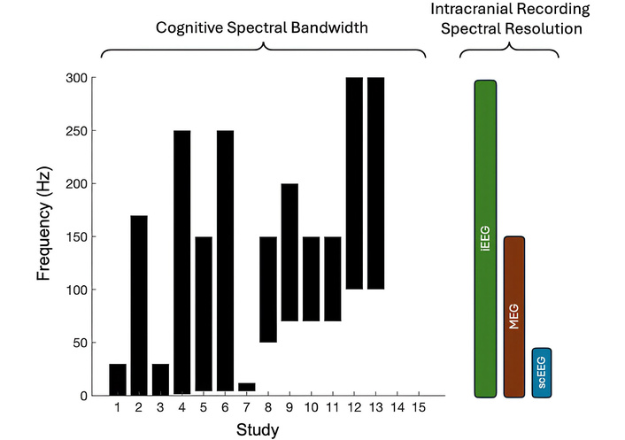 Spectral frequencies assessed in human electrophysiology studies were surveyed. Comparison of spectral bandwidth and resolution of cognition and intracranial recordings. Studies that used local field potentials most often assessed ranges above 50 Hz. Two studies (12 and 13) assessed neuronal firing rates, reflected here as frequencies above 100 Hz. iEEG provides the greatest spectral resolution compared to MEG and scEEG. MEG: magnetoencephalography; scEEG: scalp electroencephalography.