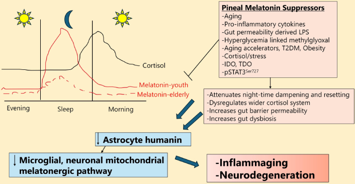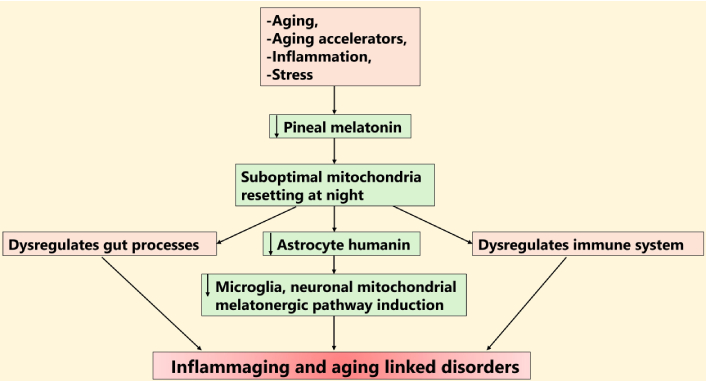 This review evaluates the hypothesis that pineal melatonin resets mitochondrial function following daytime stressors/challenges to increase mitochondrial fusion and humanin production, which then acts on neighboring glia and neurons to reset mitochondrial function and upregulate the mitochondrial melatonergic pathway, thereby resolving inflammatory activity. The suppressed capacity to produce melatonin over aging underpins inflammaging and the emergence of neurodegenerative conditions.