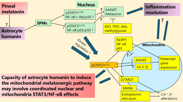 STAT3 interaction with NF-κB dimer composition in humanin melatonergic pathway regulation. The dramatic decrease in pineal melatonin over aging may attenuate its induction of astrocyte humanin and therefore the capacity of released astrocyte humanin to suppress microglia and neuronal inflammation via mitochondrial melatonergic pathway upregulation. Data in macrophages indicates that humanin increases SPMs, which can shift the NF-κB dimer composition to resolution inducing. The raised levels of IDO, TDO, and methylglyoxal over aging, especially when T2DM/hyperglycemia/hypertension is evident, suppress the availability of tryptophan, as does inadequate dietary tryptophan. Suppressed tryptophan availability attenuates the initiation of the tryptophan-melatonin pathway and, therefore, the capacity to attain resolution. The interactions of mitochondrial pSTAT3Ser727 with various processes in mitochondria, including regulating Ca2+ from the endoplasmic reticulum at MAMs, whilst also regulating 14-3-3ζ availability for AANAT stabilization to initiate the mitochondrial melatonergic pathway, as well as interacting with LETMD1 to regulate mitochondrial Ca2+ and K+, whilst also coupled with a capacity to increase the mitochondrial translocation of the NLRP3 inflammasome, NF-κB and p65 indicate potential complex effects dependent upon specific cellular circumstances. Whether pSTAT3Try705 nuclear interactions with NF-κB c-Rel/p50 to drive a resolution seeking phenotype include kinase regulation of pSTAT3Ser727 that suppresses pSTAT3Ser727 ‘detrimental’ effects at mitochondria requires investigation. Thicker arrows indicate an accumulation of processes influencing where the arrows are pointing. SPMs: specialized pro-resolving mediators; pSTAT3Tyr705: phosphorylated signal transducer and activator of transcription 3 at Tyrosine705; NF-κB: nuclear factor kappa-light-chain-enhancer of activated B cells; AANAT: aralkylamine N-acetyltransferase; IDO: indoleamine 2,3-dioxygenase; TDO: tryptophan 2,3-dioxygenase; NLRP3: NLR family pyrin domain containing 3; LETMD1: leucine zipper EF-hand containing transmembrane protein 1-domain-containing protein 1; MAMs: mitochondria-associated membranes; T2DM: type 2 diabetes mellitus.