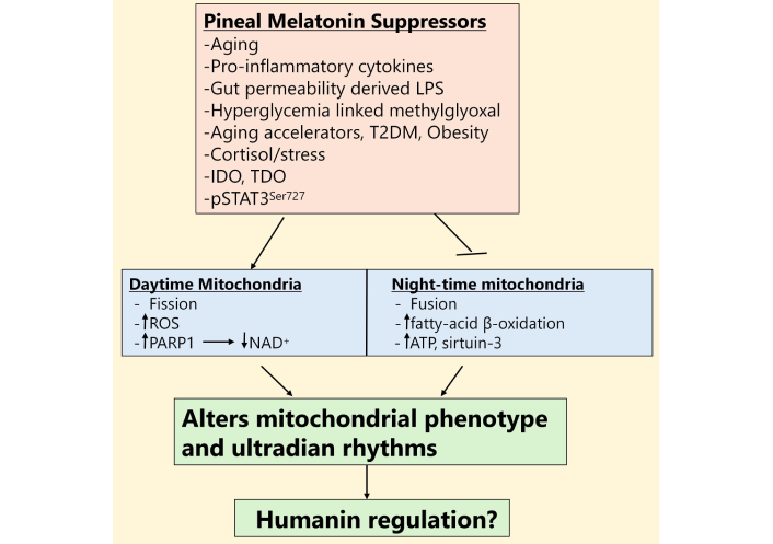 Distinct daytime and night-time mitochondrial ‘phenotypes’ are differentially regulated by pineal melatonin and its suppression. LPS: lipopolysaccharide; T2DM: type 2 diabetes mellitus; IDO: indoleamine 2,3-dioxygenase; TDO: tryptophan 2,3-dioxygenase; pSTAT3Ser727: phosphorylated signal transducer and activator of transcription 3 at Serine727; ROS: reactive oxygen species; PARP1: poly(ADP-ribose) polymerase 1; NAD+: nicotinamide adenine dinucleotide; ATP: adenosine triphosphate.